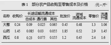 (1)通行費占農(nóng)產(chǎn)品流通環(huán)節(jié)成本的比例較小。以重點調(diào)研的幾種蔬菜為例,大蔥、山藥和西瓜各環(huán)節(jié)的價格詳見表1所列。表1中長途運輸流通成本中的“其他”包括裝卸、包裝、存儲、物品損耗、運輸燃油費、工人工資罰款和車輛維修等費用,“進城流通成本”包括批發(fā)市場攤位費、進城運輸費、停車費、罰款、超市攤位費和包裝、存儲、物品損耗等。從表1可以看出,大蔥、山藥、西瓜占長途運輸流通成本的比例分別為:28%、35%、33%,占總流通成本的比例分別為:4%、5%、11%,占產(chǎn)品最終銷售價格的比例分別為:1.2%、0.3%、3.1%。而3種農(nóng)產(chǎn)品在流通過程中每斤分別升值了1.06、1.45、1.6元,主要是從批發(fā)到零售這一環(huán)節(jié)增長的。由此可以看出,干線運輸中的通行費在農(nóng)產(chǎn)品流通過程所起的升值作用很小,即使通行費全免,也不會對收購價和零售價造成較大的影響。