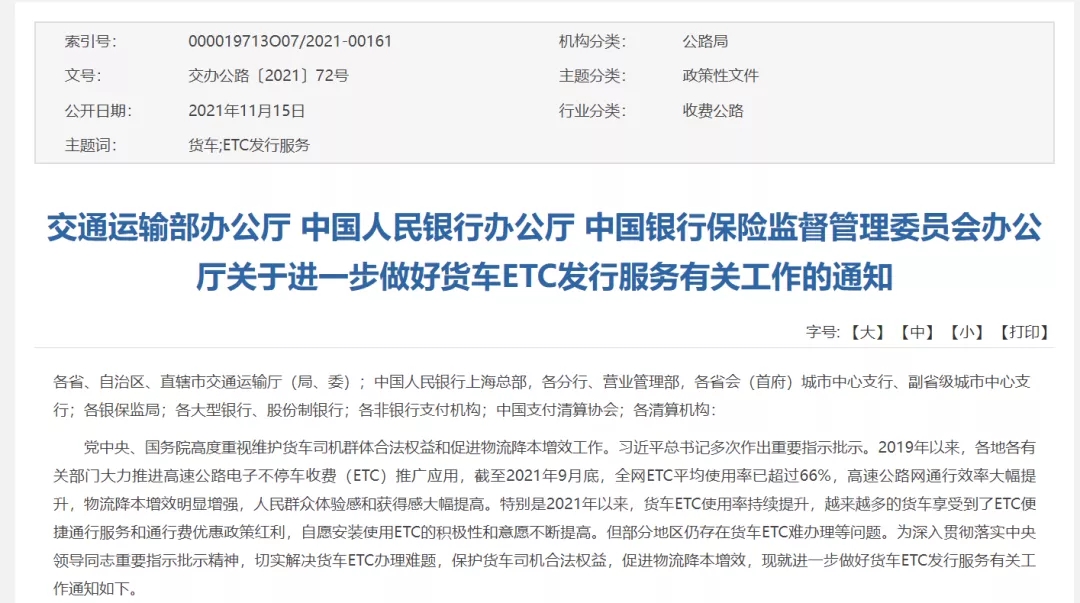 11月15日,交通運輸部辦公廳、中國人民銀行辦公廳、中國銀行保險監(jiān)督管理委員會辦公廳聯(lián)合發(fā)布《關于進一步做好貨車ETC發(fā)行服務有關工作的通知》: