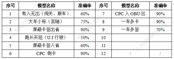 (四)稽核模型建立與準(zhǔn)確率驗證本文所述AI稽核系統(tǒng)根據(jù)不同逃費類型建立對應(yīng)模型,目前已實現(xiàn)大車小標(biāo)、有入無出、屏蔽卡簽入省、屏蔽卡簽出省、跑長買短、CPC倒卡、CPC入OBU出、一車多卡、一車多簽等近10種偷逃費行為稽核。以大車小標(biāo)偷逃費行為進(jìn)行舉例說明。改變車型(車種):大車小標(biāo)是指發(fā)行車型跟實際車型不符。通過非法手段辦理或套取使用與實際車型不符的車輛標(biāo)簽,達(dá)到偷逃費的目的。稽核數(shù)據(jù)驗證方式如下:(1)通過交易數(shù)據(jù)中的車牌、車牌顏色和車型與發(fā)行數(shù)據(jù)對比,確定大車小標(biāo);(2)利用入口稱重數(shù)據(jù),在收費數(shù)據(jù)中的入口交易數(shù)據(jù)搜索軸數(shù)與車型不符的車輛;(3)搜索收費數(shù)據(jù)中的入口交易數(shù)據(jù),車型為一型貨車,且車牌顏色為黃色的車輛;(4)篩選車輛通過ETC專道和人工車道的收費車型存在不一致的情況,通過車牌號篩選某個車牌多次出現(xiàn)兩個及以上的車型的車輛;(5)對篩選出的車輛,根據(jù)大數(shù)據(jù)平臺圖片、交易數(shù)據(jù),對特征點進(jìn)行對比分析,形成初步結(jié)論。通過對稽核模型分析數(shù)據(jù)與稽核人員核實數(shù)據(jù)對比分析,進(jìn)行稽核模型分析篩查準(zhǔn)確率驗證,稽核模型準(zhǔn)確率如表2所示。屏蔽卡簽、倒卡通行介質(zhì)等稽核模型準(zhǔn)確率較高,達(dá)90%,有入無出(闖關(guān)、跟車)、跑長買短(U/J行駛)因系統(tǒng)及計費規(guī)則、現(xiàn)場管理和證據(jù)獲取等多重因素影響,準(zhǔn)確率為50%~60%左右,但能夠滿足稽核業(yè)務(wù)需求?;四P蜏?zhǔn)確率如表2所示。