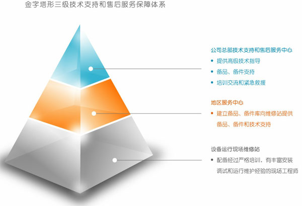 滿足客戶要求,并提供全面的技術支持和服務,是公司服務的宗旨。公司根據(jù)實際情況,建立起金字塔形的三級技術支持和售后服務保障體系。為保證設備良好運行提供最大程度的便利。